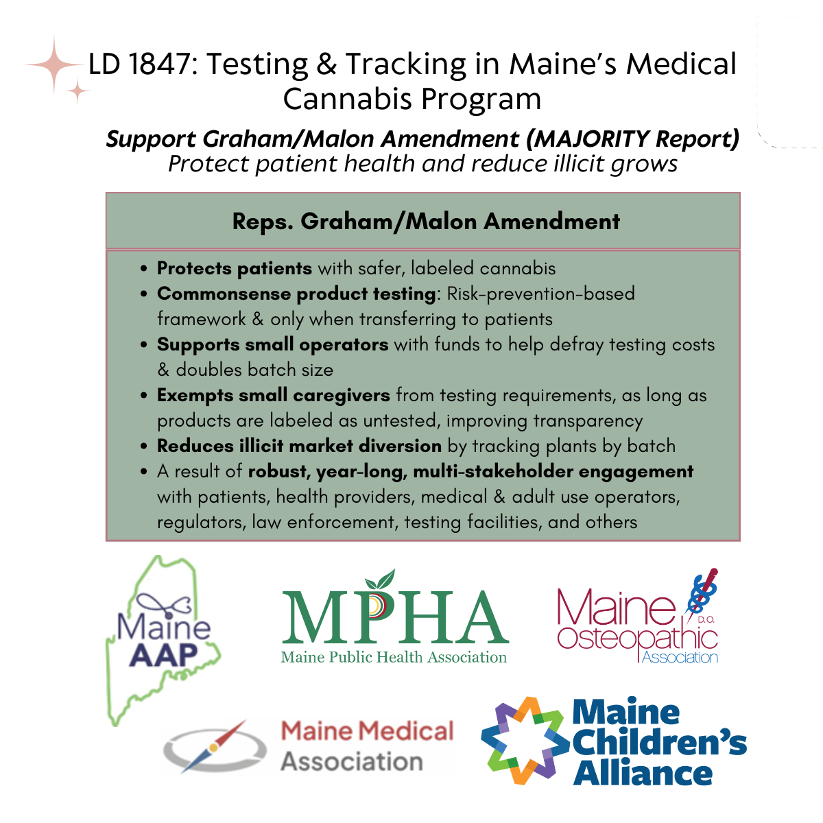 "Maine is the only state in the country where medical cannabis is not required to be tested and tracked. And this has directly led to the dramatic rise and spread of illicit cannabis operations in Maine...Untested and untracked cannabis products pose unnecessary risks to law enforcement officers. By requiring testing and tracking across the board, LD 1847 helps mitigate exposure to toxic contaminants, and balances oversight with operational efficiency...Please pass Rep. Graham’s bill with Rep. Malon’s amendment in order to give us the tools to fight these illicit grow houses, which are spreading throughout rural Maine." - Shared statement from Maine Sheriffs Association, Maine Chiefs of Police Association, Maine Department of Public Safety (Read full statement here)